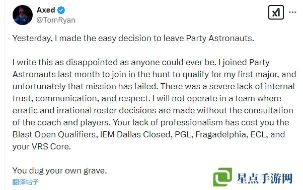 原教练Axed表示离开是“一个简单的决定”,但他对离队感到失望。他提到自己上个月加入队伍是为了争取晋级Major,但由于最近的事情不得不选择离开。