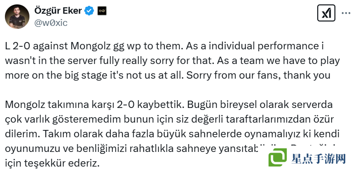 woxic:我们以0-2输给了The MongolZ。我为今天在比赛中没有全力以赴而感到抱歉。作为一个团队,我们需要在重要赛事中表现得更好,今天并没有打出我们的真实实力。我真诚地向我们的粉丝道歉,并感谢你们的支持。