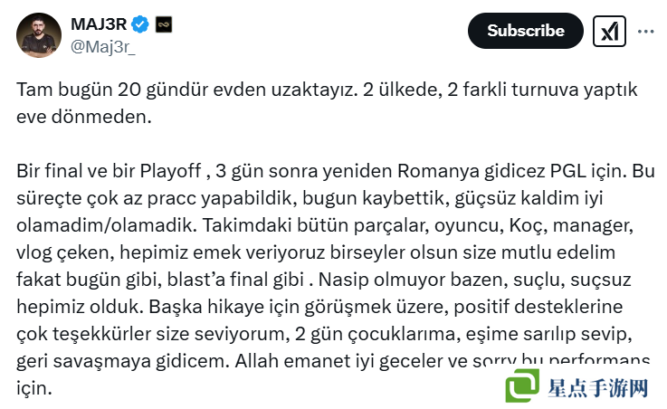 我们经历了一场决赛和一场淘汰赛,三天后我们将前往罗马尼亚参加PGL。在这段时间里,我们几乎没有进行太多的训练,遗憾的是,今天我们输了。我的状态不佳,表现不理想。团队的每一位成员——包括选手、教练、经理以及记录我们旅程的人——都在努力实现一些对你们有意义的目标,带给你们快乐,但像今天这样的日子,类似于BLAST的决赛,有时就是会发生。有时候,事情就是不如意,我们都要为此承担责任,无论是否真的有过错。