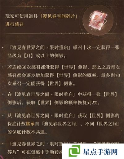 「渡见春」世界等级侧影感召概率限时提升,玩家仅可使用道具「渡见春空间碎片」进行感召。