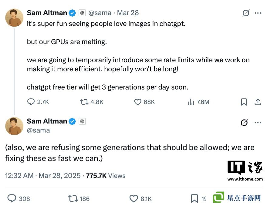 不过本站注意到,目前奥尔特曼又发文,宣布由于用户“生成吉卜力工作室风格图片”行为存在版权争议,同时平台用户数量短时间内激增导致服务器吃不消,因此目前官方将限制 ChatGPT文生图速率,同时禁止ChatGPT 通过提示词直接生成相应“吉卜力”风格图片。