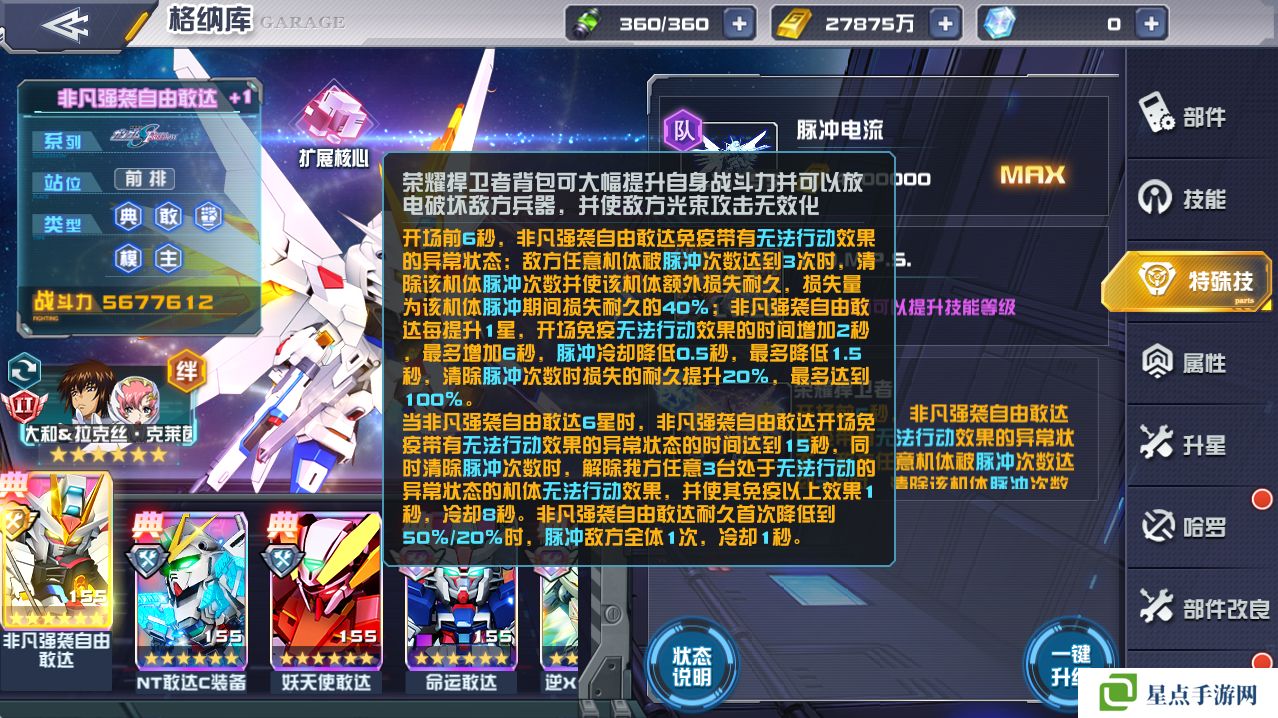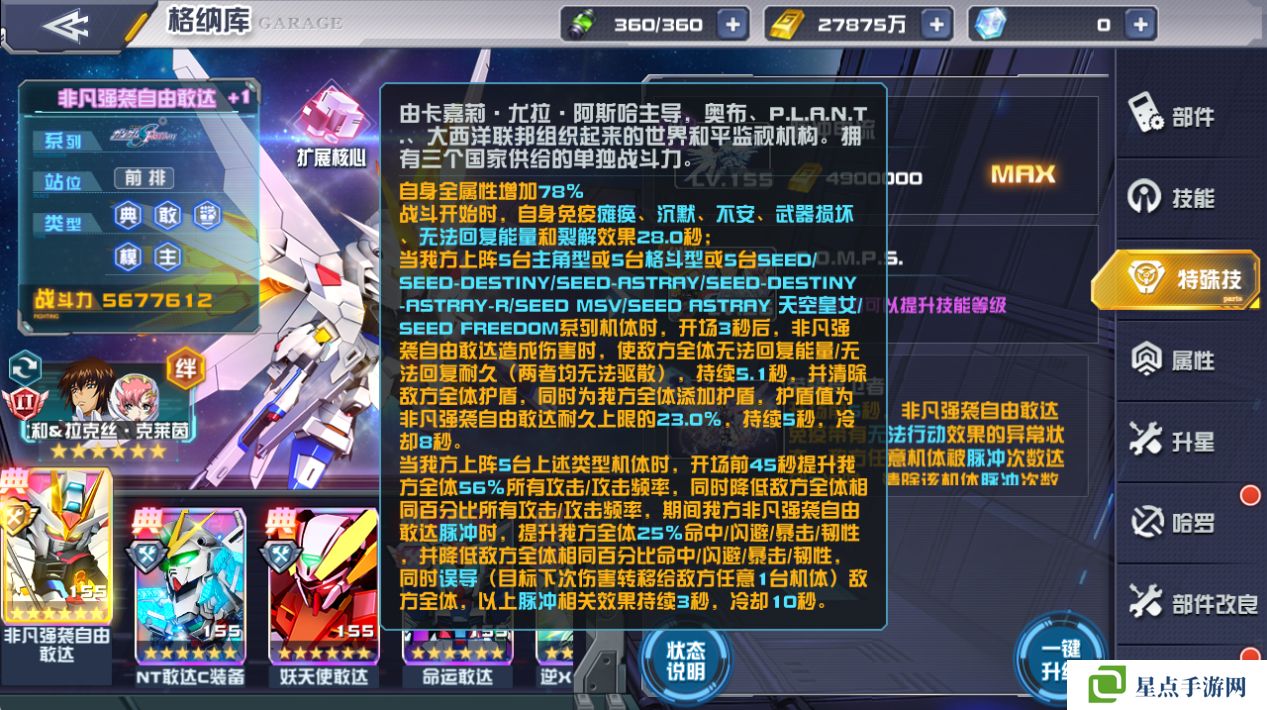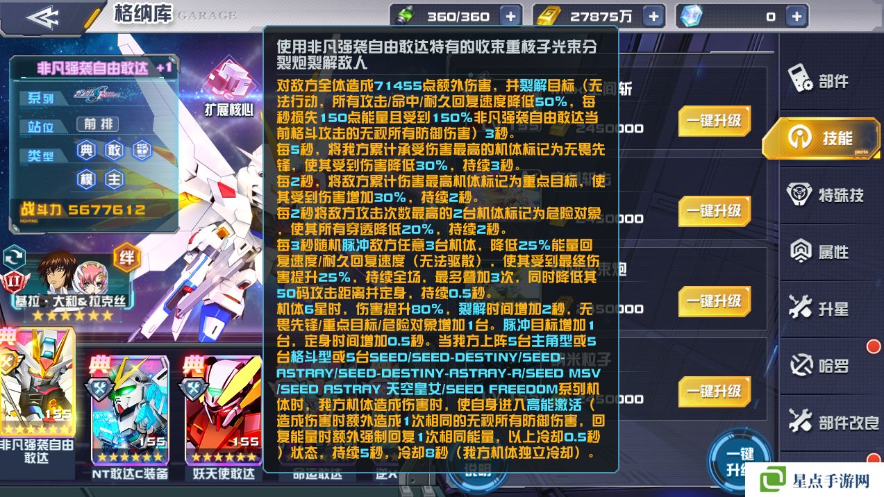 设定如此强劲的机体,非凡强袭自由敢达在游戏中的表现也自然是不容小觑。技能在体现机体各种特色武装的基础上效果也是相当强劲,除了作为seed系列的最终机体给同系列机体提供的强大加成,单体作战能力也是堪称一绝。