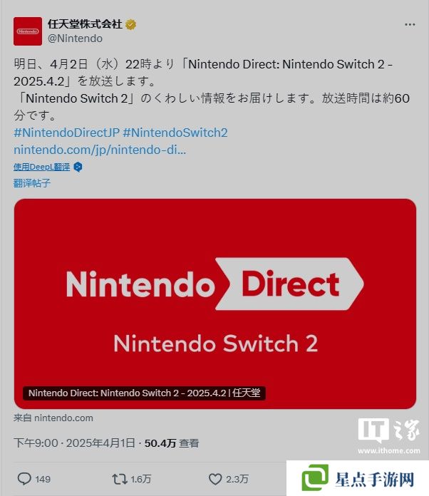 本站 4 月 1 日消息,任天堂将于北美东部夏令时间4月2日早上9点(本站注:北京时间4月2日晚上 9 点)举办Switch 2直面会,目前官方透露该直面会时长为60分钟。