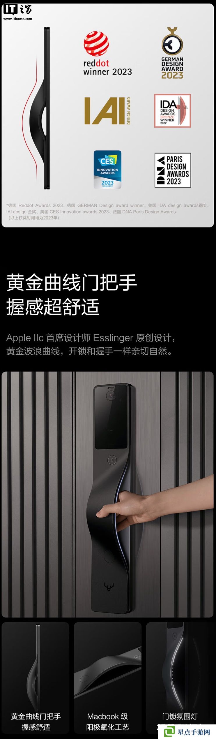 该门锁可选黑灰双色,表面使用阳极氧化工艺,配备 27 颗灯珠氛围灯,拥有“黄金波浪曲线”设计。