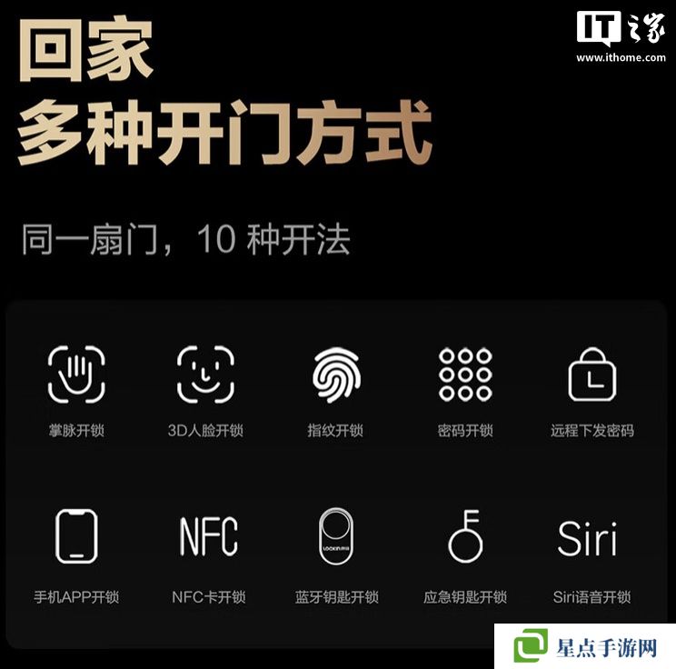 该门锁应用了多眸掌静脉识别技术,同时配备结构光3D解锁,其他方面还支持指纹开锁、密码开锁、手机App开锁、NFC卡开锁、蓝牙钥匙开锁、Siri语音开锁、应急钥匙开锁。