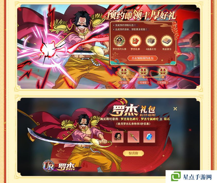 在活动期间,船长们可以召集指定数量的好友一起回归游戏。当邀请满20人时,玩家将获赠爱刀艾斯作为奖励。此外,通过绑定码被成功邀请登录游戏的受邀玩家在登录游戏后即可领取烬角色碎片、海盗便当、SS+级料理包和罗杰抽卡币的回归礼包。这不仅是对老玩家的回馈,也是对新玩家的欢迎。同时在活动期间,领取预约礼包可获得【罗杰预约头像】【罗杰礼券】等超值好礼。使用【罗杰礼券】可解锁超低折扣罗杰礼包,玩家可以在罗杰上线期间以128元的超值特惠价格购买1次罗杰特惠礼包。礼包内含:罗杰角色碎片、罗杰专属碎片及钻石,价值将低至2折。这是一次不容错过的机会,让航海之旅更加精彩。所以,快带上好友们一起加入这场盛宴吧!
