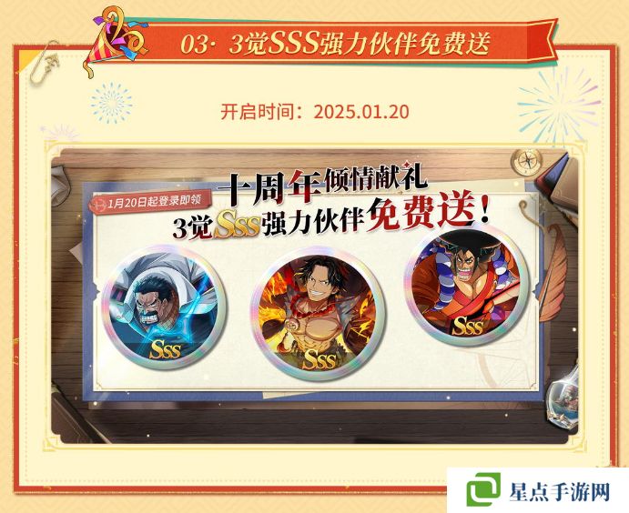 在这次十周年庆典中,《航海王启航》为每位玩家准备了丰厚的礼物。玩家只需登录游戏,就有机会免费领取以下任意一个所选伙伴提升至3觉的碎片数量:SSS火拳艾斯、SSS光月御殿、SSS海军英雄·戈普。这些强大的伙伴将助您一臂之力,让您的战力更上一层楼。同时,只要玩家在活动期间每日登录游戏,就可以免费领取一名全新的伙伴。而且,这次活动共计可领取100名伙伴,让您的航海之旅更加丰富多彩。