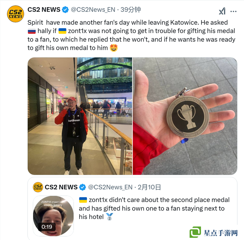 Vitality未能卫冕之后,Spirit选手zont1x在赛后将自己的亚军奖牌赠送给了一位粉丝。