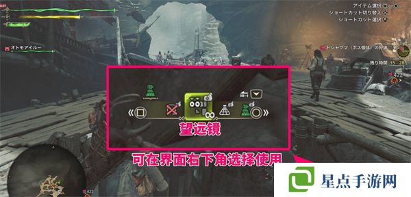望远镜可以在物品滑块中选择使用。你需要按住 R1,然后按 □ 或 ○ 键来调整物品滑块,松开 R1 后按 □ 键来使用望远镜。