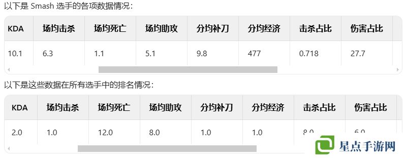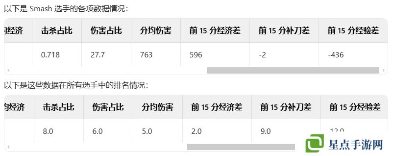 而在前15分钟的补刀差和经验差上,Smash的整体排名则相对靠后,前15分经验差为-436排名第12,前15分补刀差为-2排名第9。