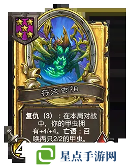 改动前:2/7。复仇(4):你的甲虫在本局对战中拥有+2/+2。亡语:召唤一只2/2的甲虫。