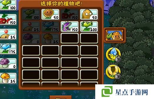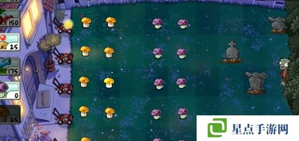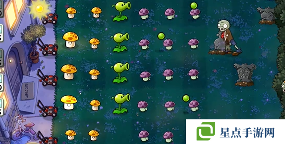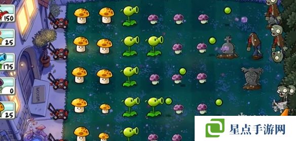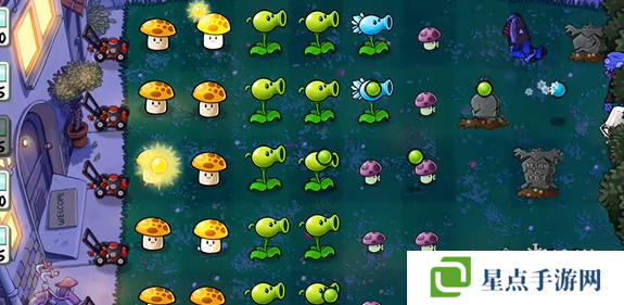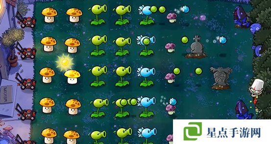 4、在阳光菇和小喷菇中间种植四个豌豆射手。