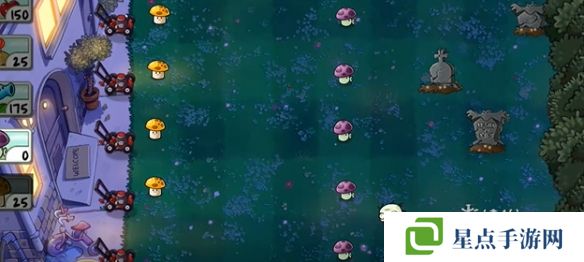 3、补齐左侧的一列阳光菇,再种植一列阳光菇和一列小喷菇。
