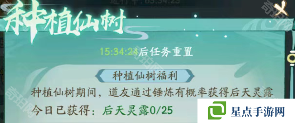 使用后天灵露,可以增加仙树的种植进度,种植进度有10,20,30,50四种,种植进度满后可提高仙树的等级,获得种植奖励,重要的奖励节点有24重天的吉吉国王×30,65重天的神话法宝九圣玄羚冠×1
