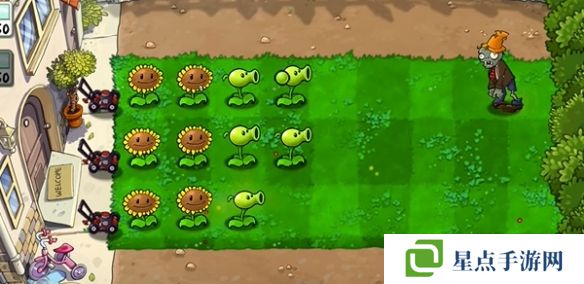 5、补齐左侧的两列向日葵,在向日葵右侧种植一列豌豆射手。