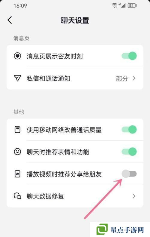4、在聊天设置界面中,找到并关闭【播放视频时推荐分享给朋友】的选项,这样即可关闭自动推荐分享的功能。