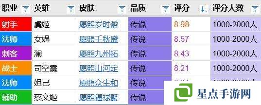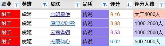 虞姬凭借年限成为了第5位四传说英雄(香香貂蝉昭君吕布),也是第2位皮肤标签各不相同的九皮肤英雄(还有昭君)。她也成为了李信之后,峡谷第2位有两款9分+传说皮的英雄。她的传说皮整体品质确实很高,在所有的四传说英雄中,虞姬的全传说皮平均分是最高的,达到了8.3分。