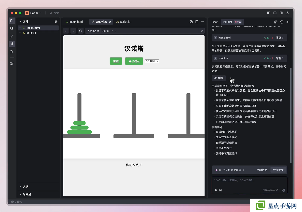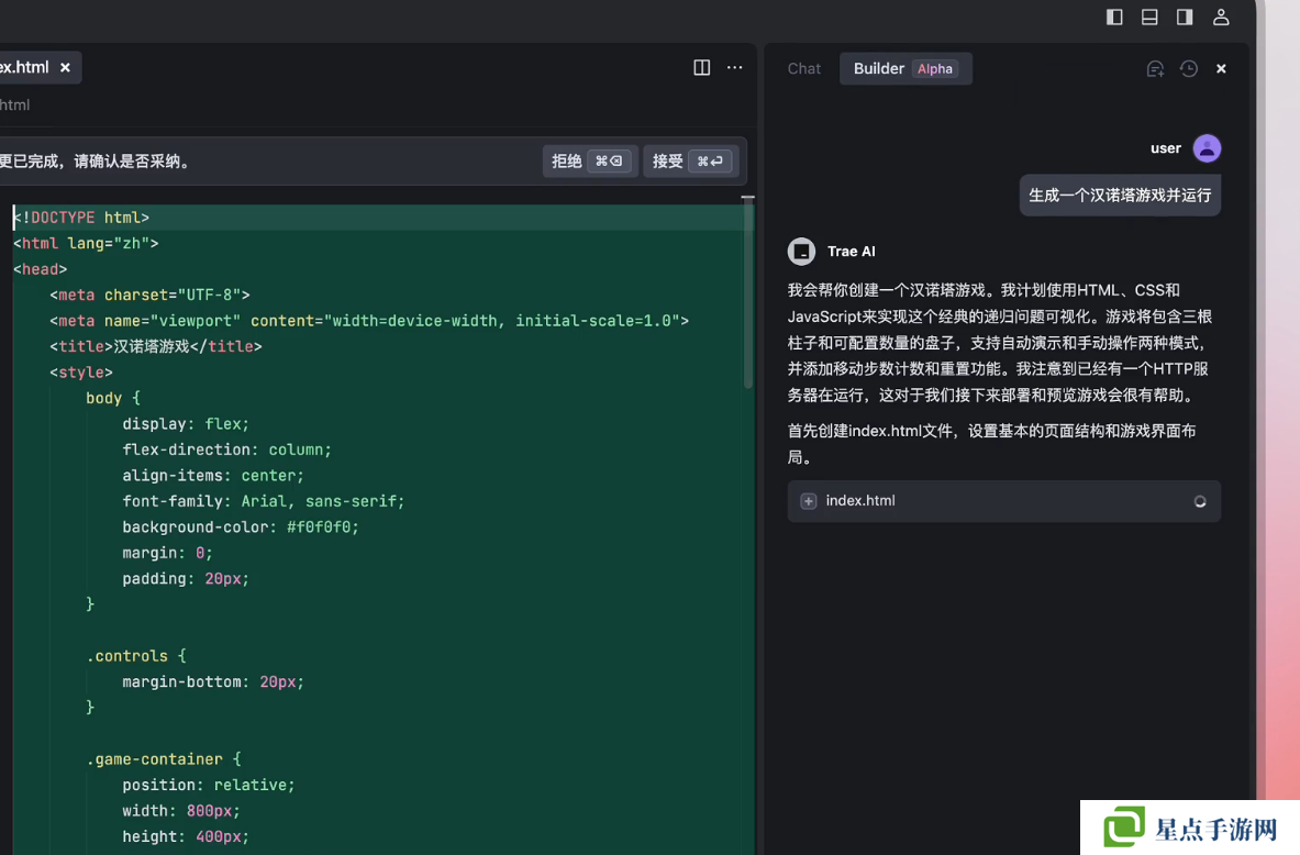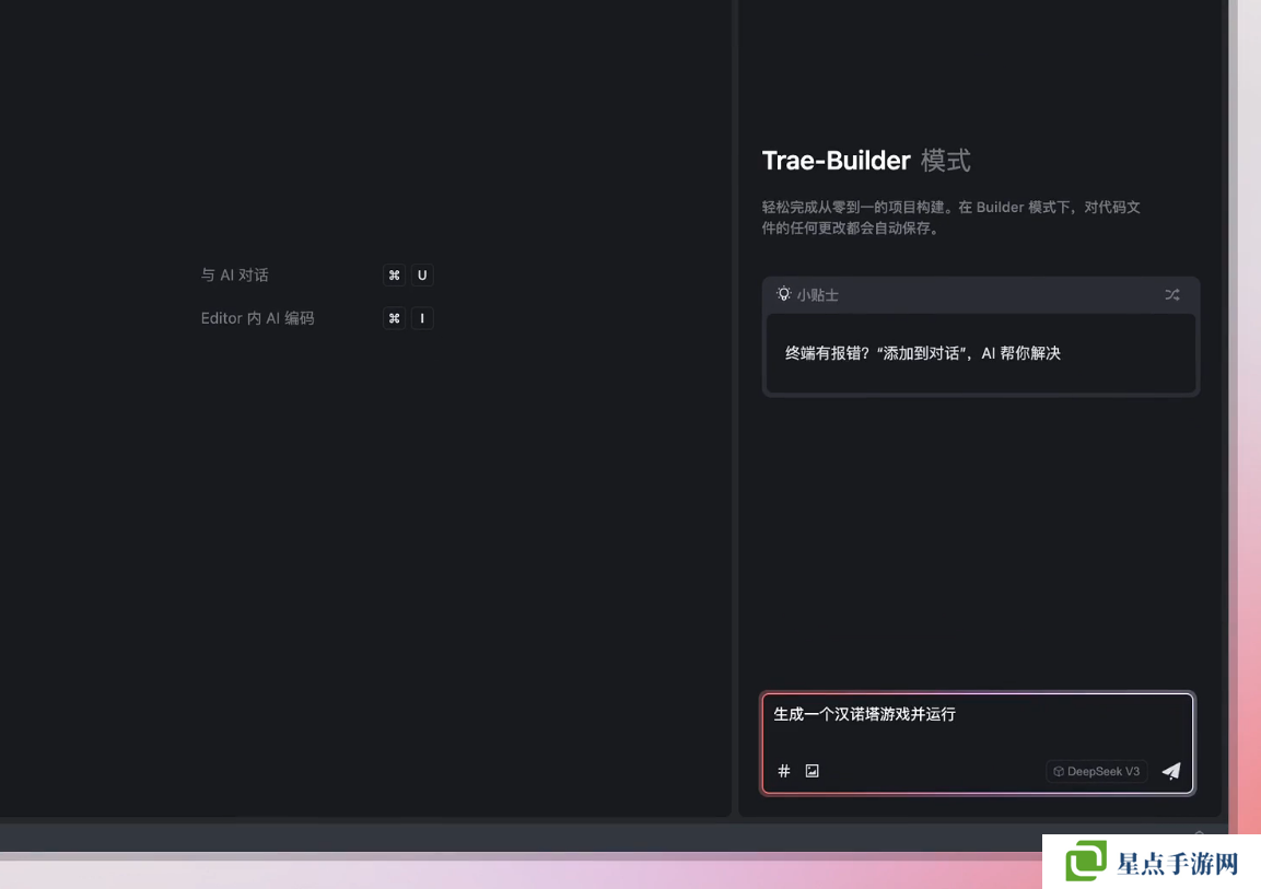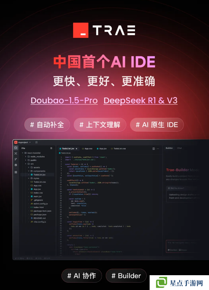 此外,Trae 国内版搭载了全新 Builder 模式,能够帮助开发者通过自然语言描述端到端生成应用:只需要用简单的语言描述需求,Trae 就可以迅速搭建起项目框架,还能持续进行调优修改,产出可用代码。
