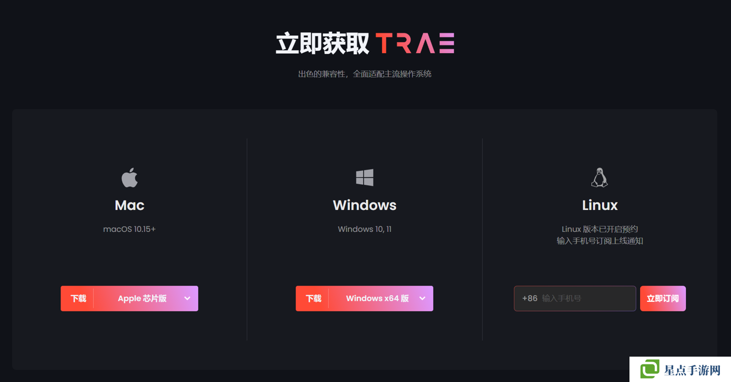 Trae 国内版官网现已上线,本站访问获悉,该应用目前提供 Mac(macOS 10.15 及以上)和 Windows 版(Windows 10、11),后续还有 Linux 版。