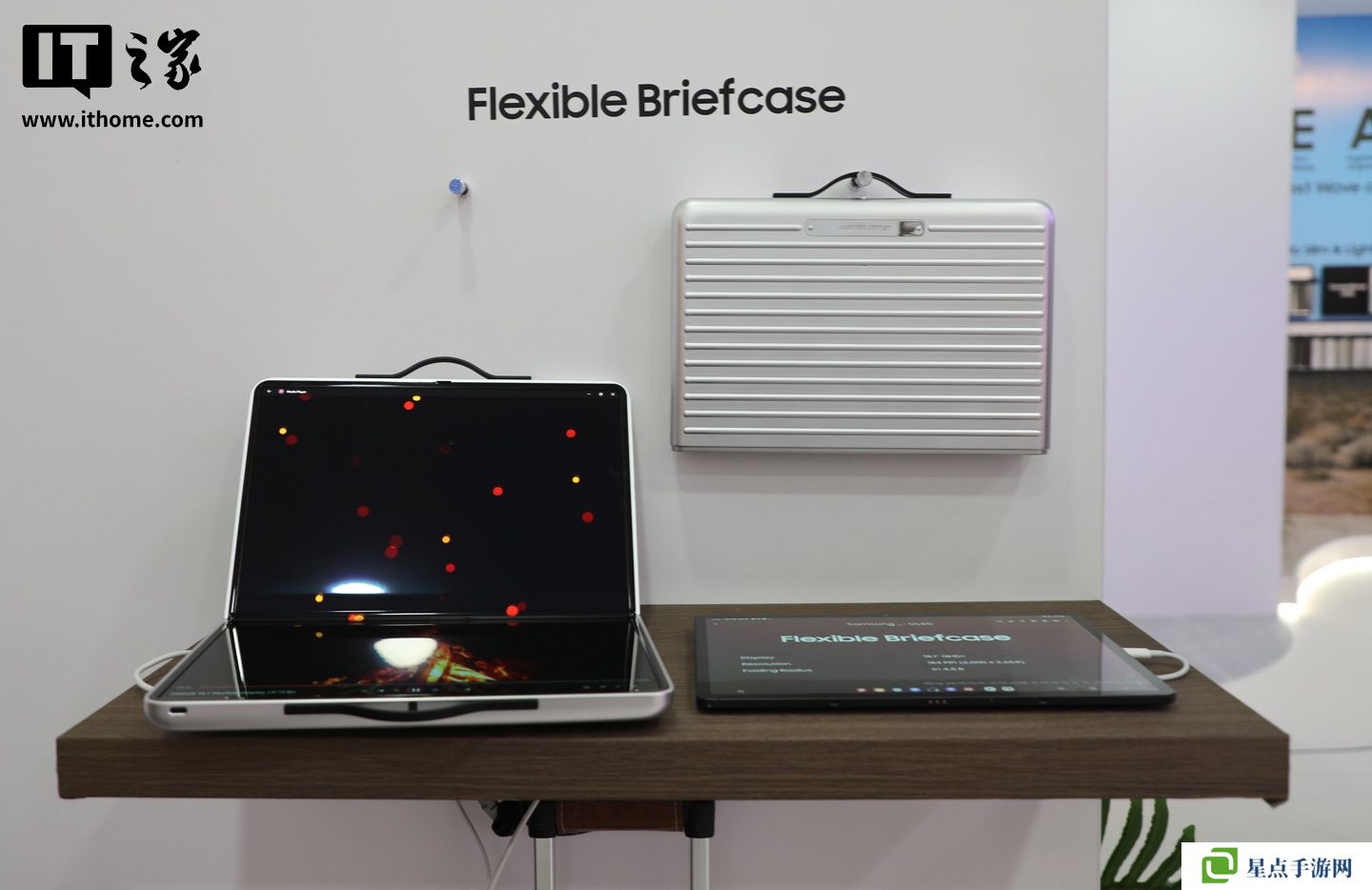 在柔性和无边框 OLED 技术方面,三星带来了三款引人注目的概念产品。其中包括一款可完全弯曲的三星“柔性游戏”掌机、一款总屏幕尺寸为 18.1 英寸的“柔性机舱包”可折叠 OLED 公文包,以及通过将十个 6.8 英寸的 OLED 面板拼接在一起形成的无边框“OLED 瓷砖”,共同构成一个单一显示屏。
