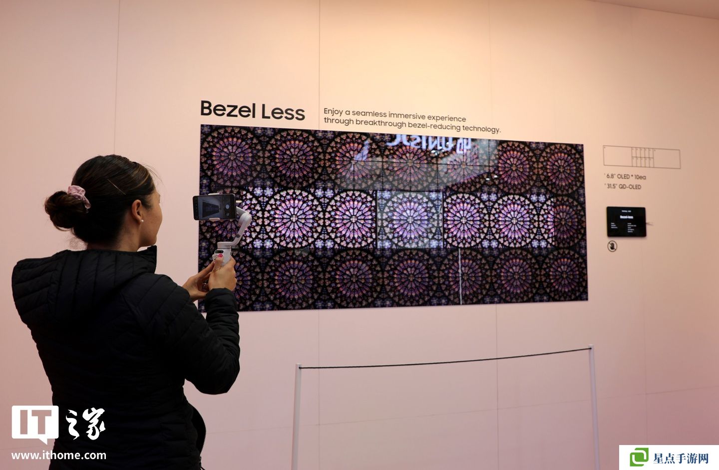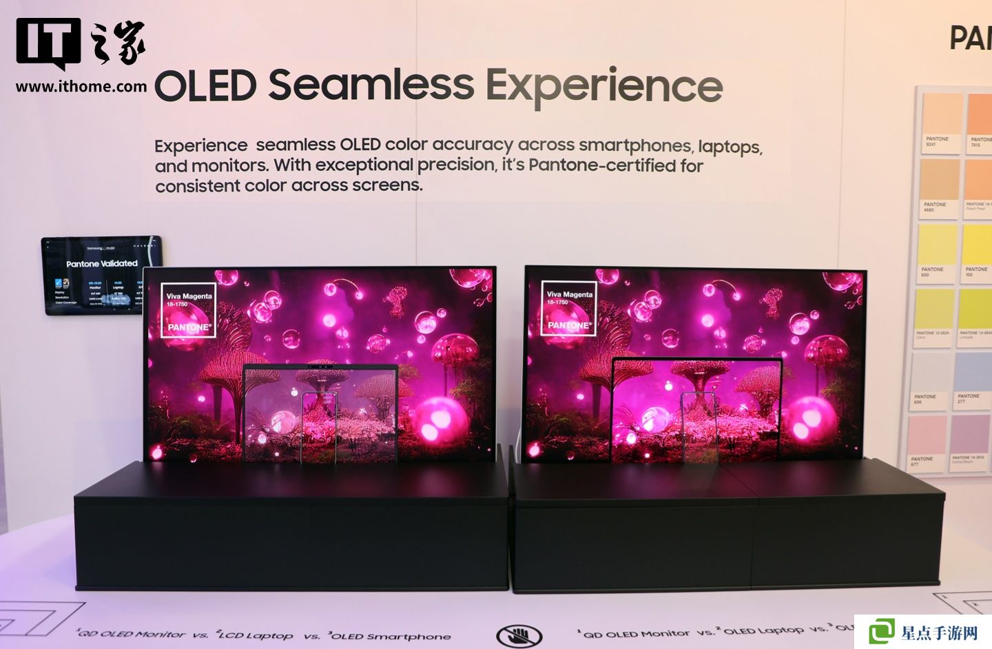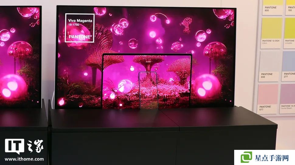 其次是三星的“无缝色彩工作室”展示区,通过在两侧分别放置 OLED 智能手机和大显示器,突出了左侧的 LCD 笔记本电脑显示屏即使经过与右侧 OLED 笔记本电脑显示屏相同的色彩校准,也无法与周围显示屏保持色彩一致性。如果没有三星进一步完善其 OLED 制造能力,使其能够在手持设备(6.7 英寸)屏幕尺寸上实现真正高亮度(1000 尼特)的 OLED 面板,这一展示是不可能实现的。