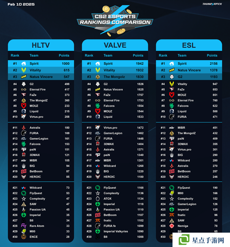 近日,有外媒统计了V社、HLTV与ESL三家权威世界战队排名情况,并进行了对比(截止2025年2月10日)。