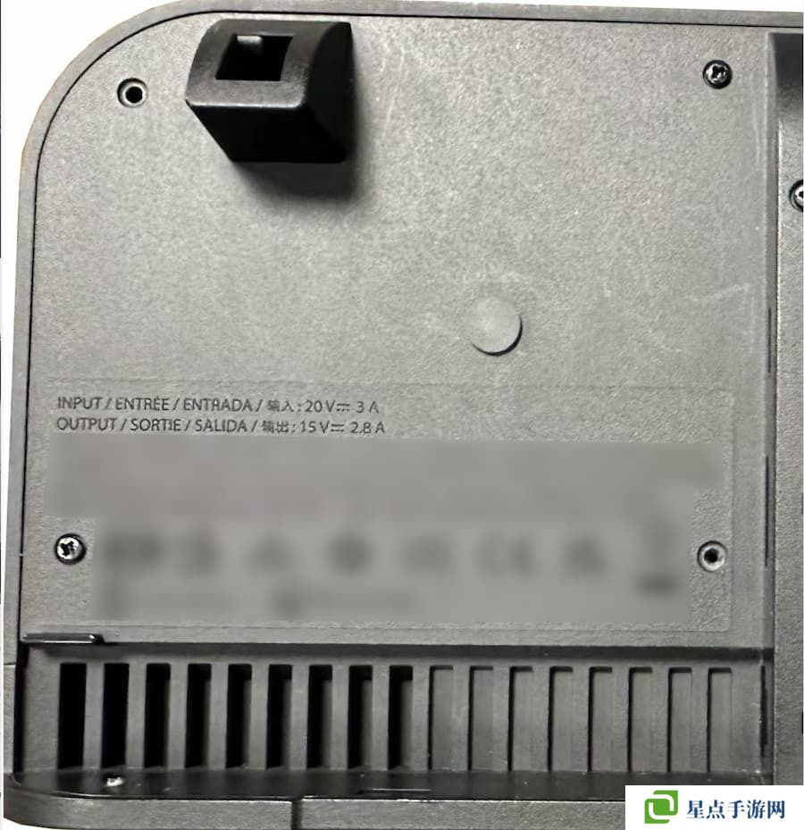 这款新底座配有弧形边缘和哑光黑色饰面,共享图片中有些信息被遮住了,但我们可以知道 Nintendo Switch 2 的输入电压为 20 伏,输出为 15 伏。