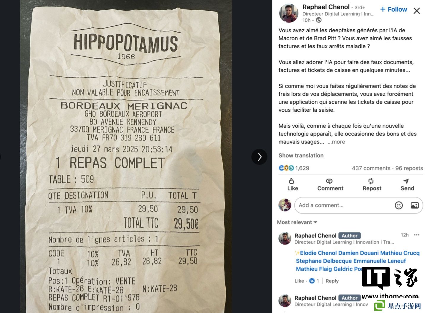 社交媒体用户、风险投资家德迪・达斯在 X 平台上发布了一张他声称是用 4o 生成的旧金山一家真实牛排餐厅的假收据照片。随后,其他人也成功复制出了类似的结果,甚至有人添加了食物或饮料污渍,让收据看起来更加逼真。本站注意到,最逼真的例子之一来自法国,一名领英用户发布了一张当地餐饮连锁店的皱巴巴的 AI 生成收据。