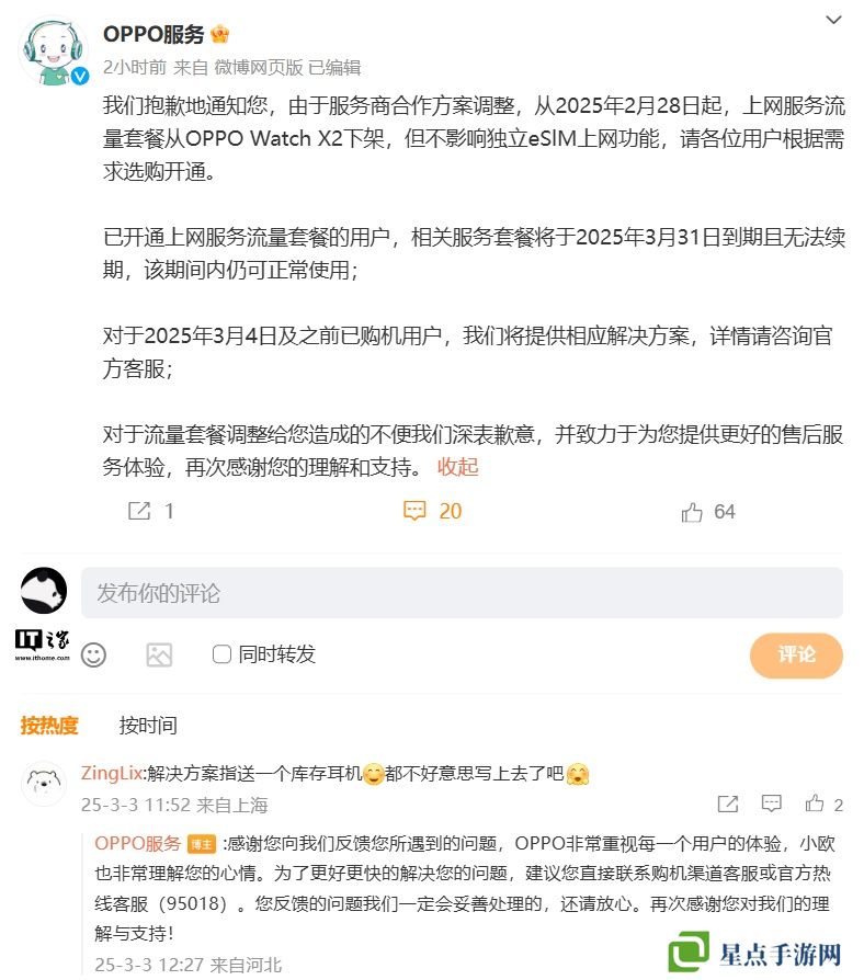 本站 3 月 3 日消息,OPPO 服务官方微博今日发布通知:由于服务商合作方案调整,从 2025 年 2 月 28 日起,上网服务流量套餐从 OPPO Watch X2 下架,但不影响独立 eSIM 上网功能。