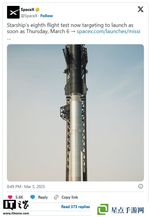 SpaceX 宣布星舰第八次试飞新目标日期:当地时间 3 月 6 日