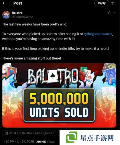 去年热门的扑克牌主题Rougelite独立游戏《小丑牌》,近日在官推发文庆祝,表示游戏已售出超过500万份。