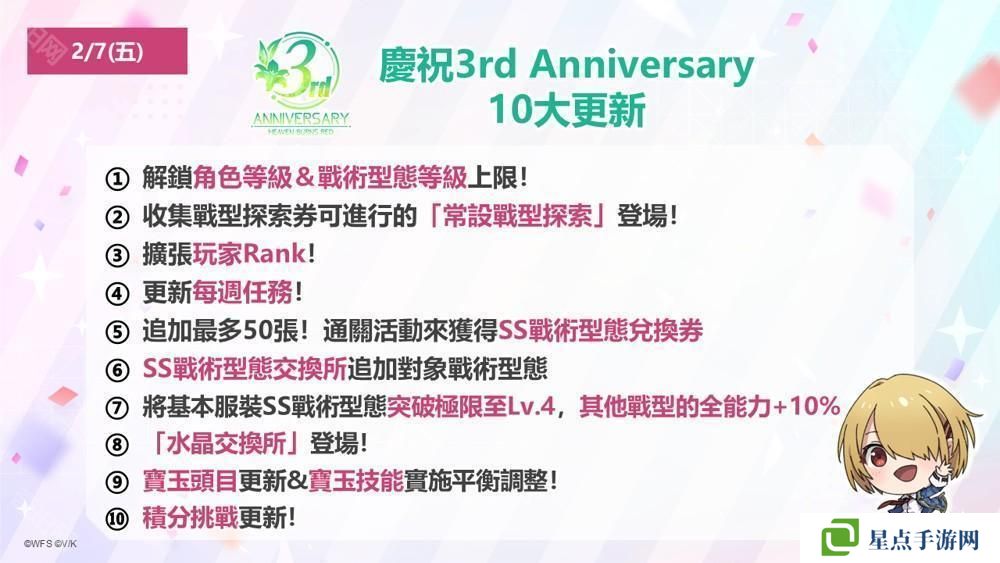 官方预计于 2 月 7 日(五)释出的 Ver.5.3.0 更新版本中,实施「庆祝 3rd Anniversary 的 10 大更新」,将解锁等级上限和追加常设战型探索等,实施各种改善和追加功能。