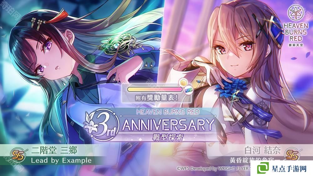 SS [黄昏绽放的角宿一] 白河结奈、SS [Lead by Example] 二阶堂三乡登场。庆祝绯染天空 3rd Anniversary 的视觉图中,身穿新衣服的白河结奈和二阶堂三乡将作为庆祝 3 周年的新战术型态登场。