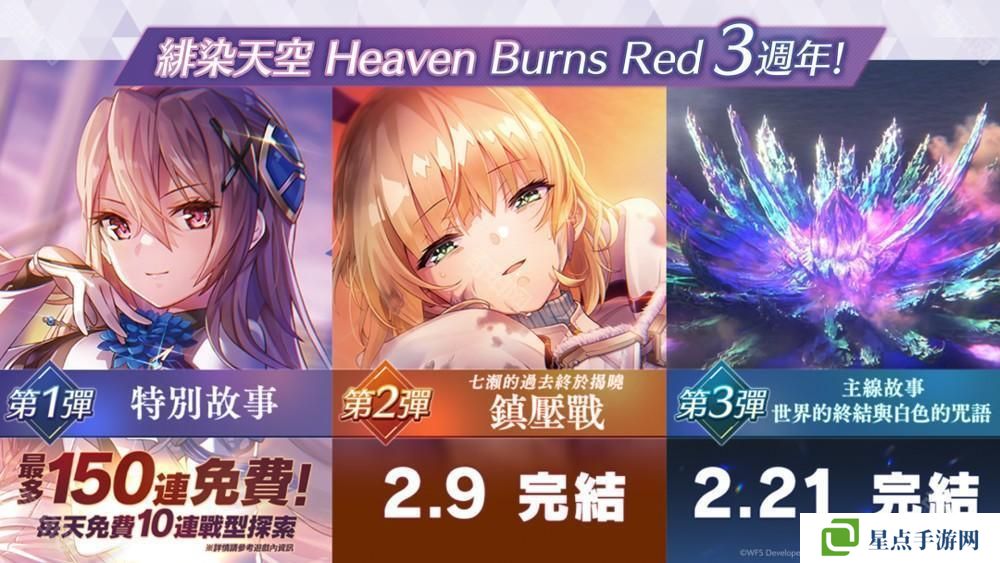 官方为纪念 3 周年,预计举办全 3 弹特别活动。此外,也介绍了最多 150 连免费战型探索等豪华特别活动、点缀 3 周年的三大故事内容,还有主旨为「让绯染天空的培育更加轻松!」的 10 大更新等。