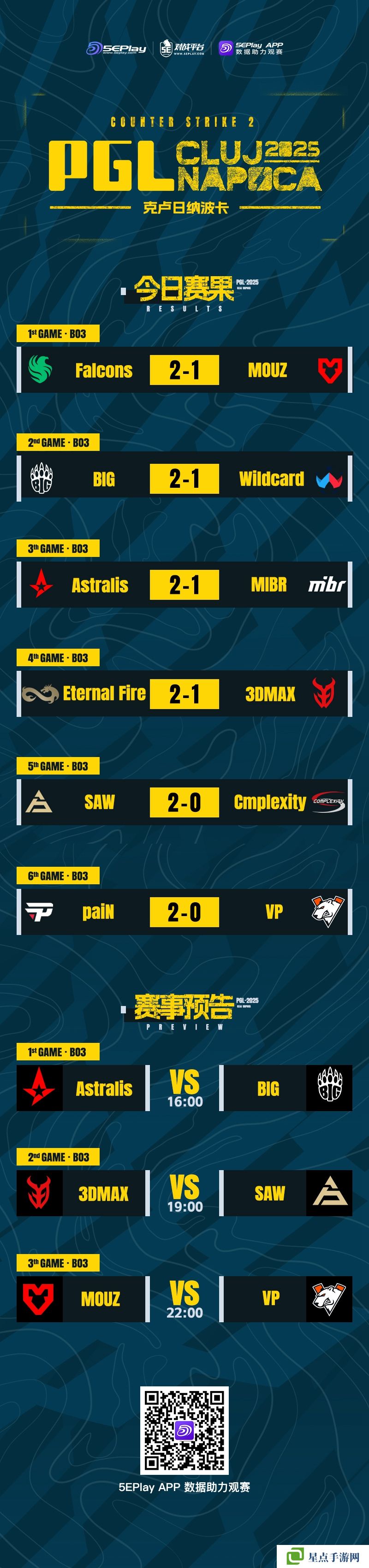 Complexity遭遇淘汰。在明日比赛中,A队将迎战BIG,MOUZ对阵VP,3DMAX则是要与SAW一较高下。以下为今日赛果、明日预告一览: