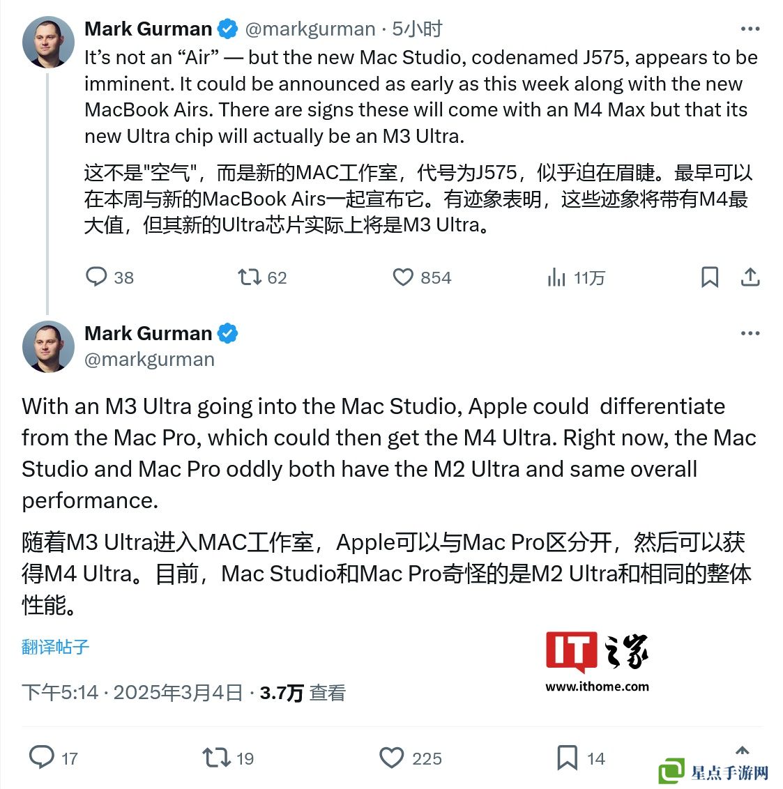本站 3 月 5 日消息,彭博社记者马克・古尔曼(Mark Gurman)今天(3 月 5 日)在 X 平台发布推文,曝料称苹果将于本周推出新款 Mac Studio。