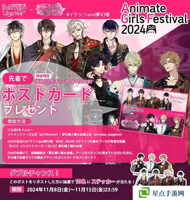 《梦幻楼与不眠之蝶》也预定参加将于 2024 年 11 月 9 日(六)、10 日(日)举办的「Animate Girls Festival2024」。官方表示,AGF2024《梦幻楼与不眠之蝶》摊位将与由 CYBIRD 营运的热门恋爱游戏「美男系列」合作举办「#美男系列 and 梦幻楼 AGF2024 明信片企划」。当天至现场参加此活动,即获赠一张限定款明信片,再转贴指定贴文还有机会抽中贴纸。活动详情可参阅官方网站。