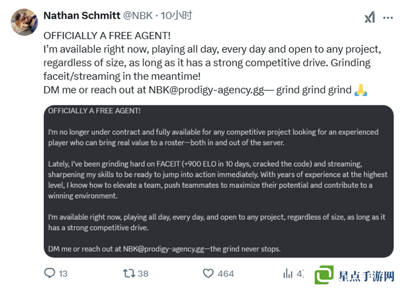 我目前已恢复自由身,我全天都有空打比赛,愿意加入任何战队,无论规模大小,只要有强烈的竞争决心。在此期间,我会在平台刻苦训练并进行直播!