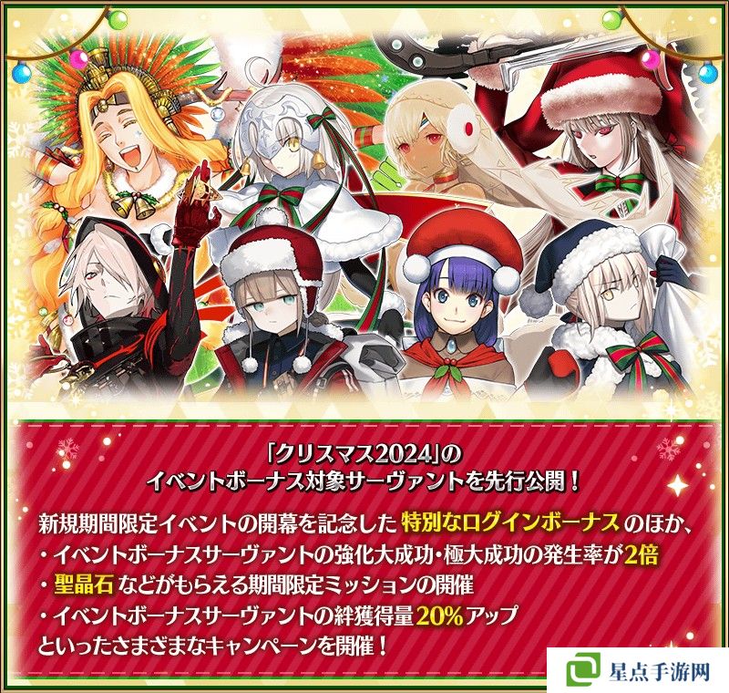 面对即将自 12 月 11日举办期间限定活动「圣诞节 2024」,率先在期间内 12 月 4 日~12 月 18 日实施举办前预热活动,内容包含了特别登入次数登入奖励、期间限定任务、活动加成从者 犟化大成功・极大成功 2 倍&羁绊获得量提升 20%。