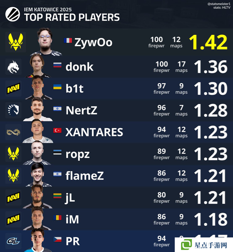 在本次IEM 卡托维兹站中,donk也是Spirit队员中唯一进入rating榜单前十的选手。