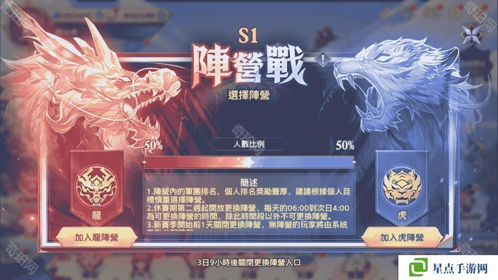 升级二:阵营可自由选择。各地区玩家以及军团,可自由选择进入「龙阵营」或「虎阵营」。避免根据地区而自动划分阵营所带来的阵营间玩家数量不平衡的问题。