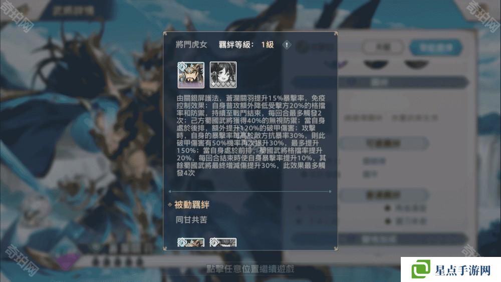「苍澜关羽」可分别与「关银屏」与「关平」组成羁绊效果。与「关银屏」组成羁绊时,可以使蜀国队伍的进攻防御属性都得到提高。在「关平」羁绊下,则无需任何助力就能为己方武将锁血,为团队提供了超强的生存保障。苍澜关羽的这两个羁绊都非常适配蜀国队伍,和蜀国武将一起出战必能达到事半功倍的效果,带领蜀国队伍再攀登巅峰!