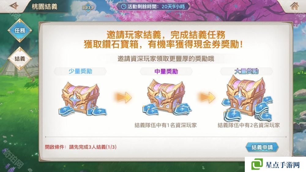 邀请 3 名好友共玩游戏,完成「桃园结义」任务,即可获取钻石宝箱!邀请的玩家更资深,则奖励更丰富!宝箱中除了能领取大量幻星和觉醒石等养成资源外,甚至还有机会拿到现金券奖励哦!