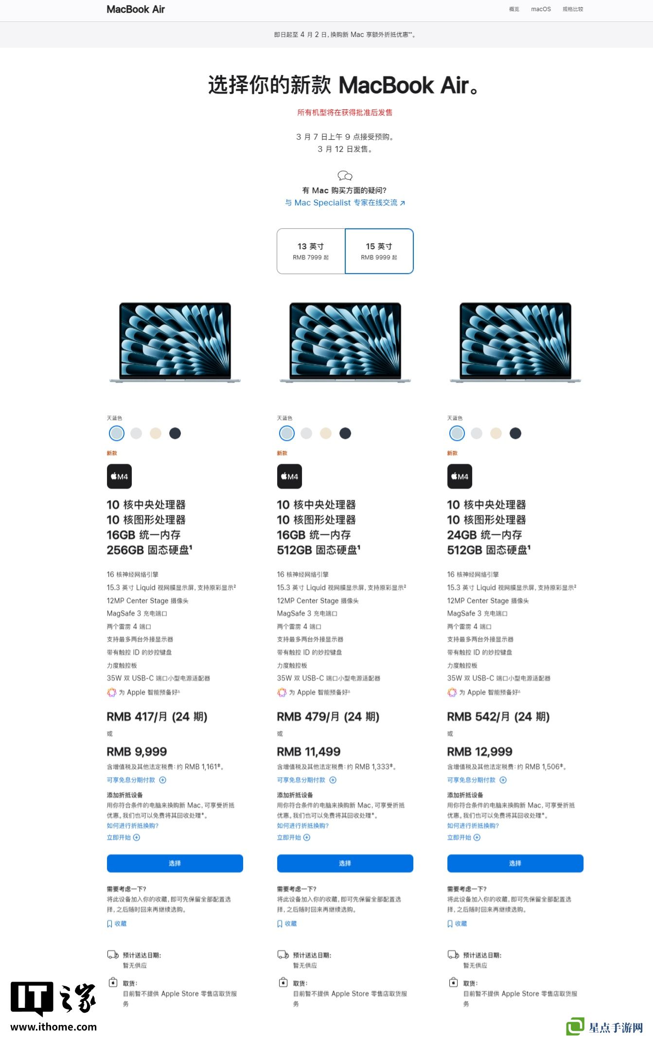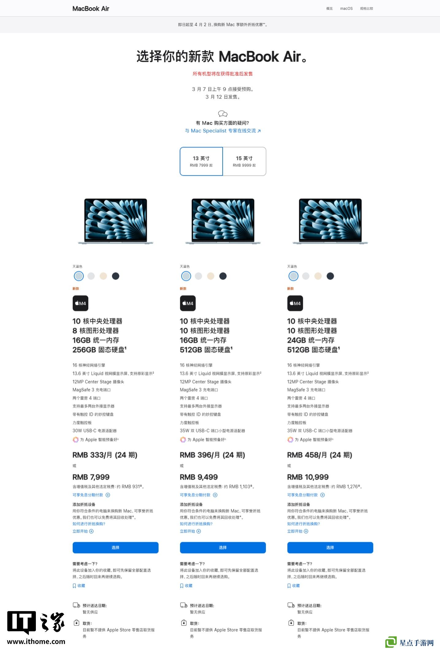 本站 3 月 5 日消息,苹果发布配备 M4 芯片13 英寸和 15 英寸 MacBook Air 新机型,并新增“天蓝色”配色,国行售价 7999 元起(点此查看),较上一代下调 1000 元,具体售价如下: