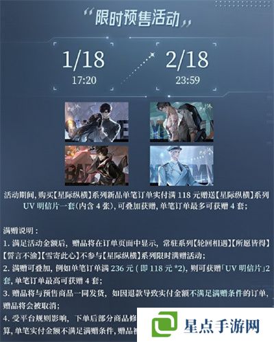 ✦ 满赠可叠加,例如单笔订单满236元(即118元*2),则可获赠【UV明信片】2套,单笔订单最高可获赠4套;