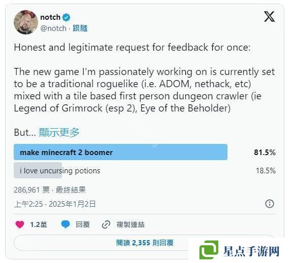 《Minecraft(我的世界)》创造者 Notch 近日通过 X (旧称 Twitter)平台表示下一款游戏将是《Minecraft》精神续作,「基本上可以视为宣布了《Minecraft 2》」,然而1月7日时事态出现戏剧化转折,Notch 最终表示他将不会制作《Minecraft 2》,而是专心开发 Roguelike 新作。