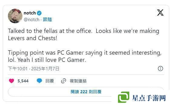 Notch 在社群平台 X 上表示:「和办公室的伙伴们聊过后,看来我们将制作《Levers and Chests》」,并透露关键原因是因为有游戏媒体称赞它「看起来很有趣」。
