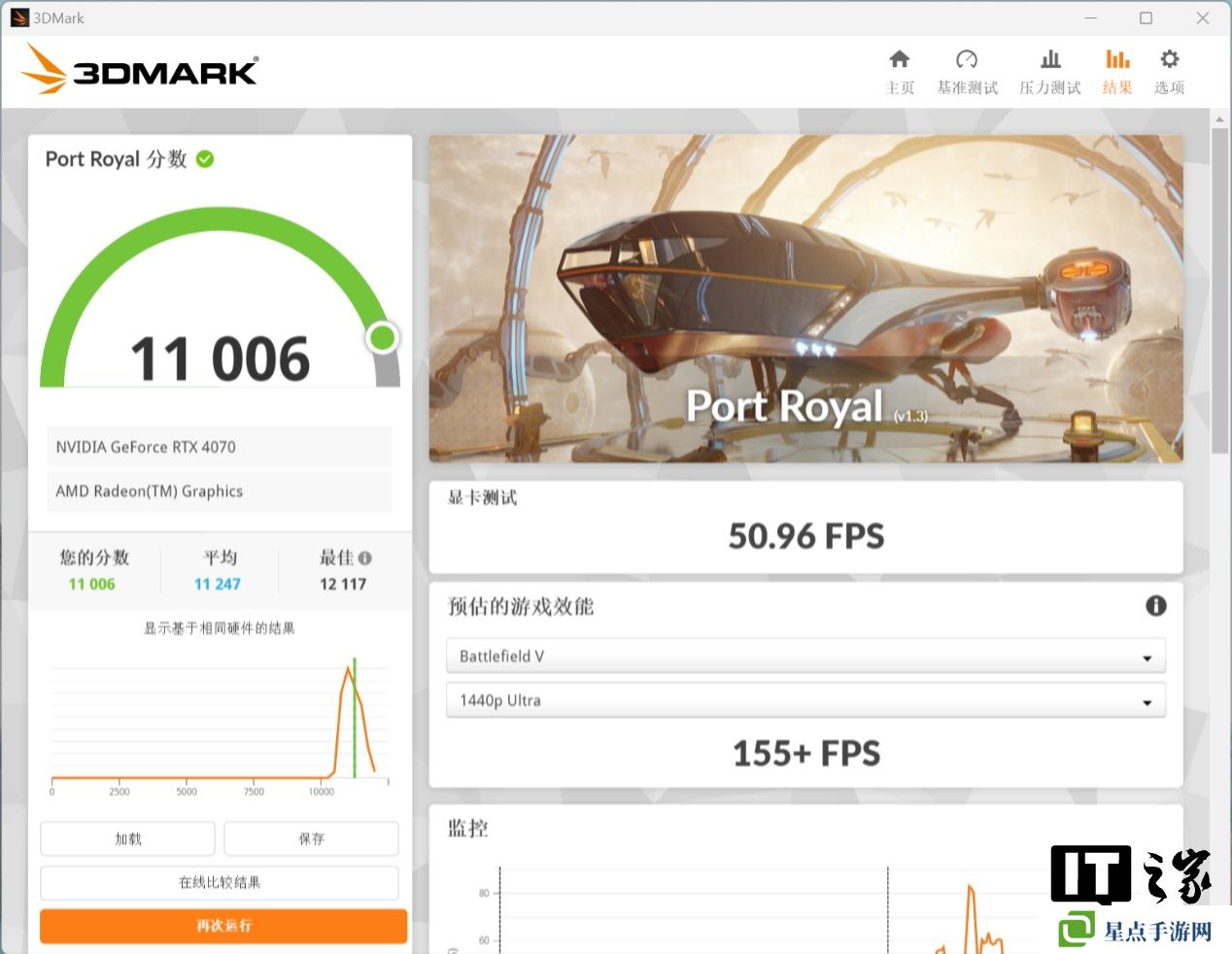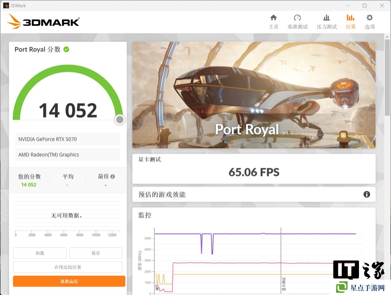 在 3DMark Portal Royal 实时光追测试中,NVIDIA GeForce RTX 5070 显卡的综合分为 14052 分,对比 NVIDIA GeForce RTX 4070 显卡的 11006 分,提升幅度达到了 27.6%。