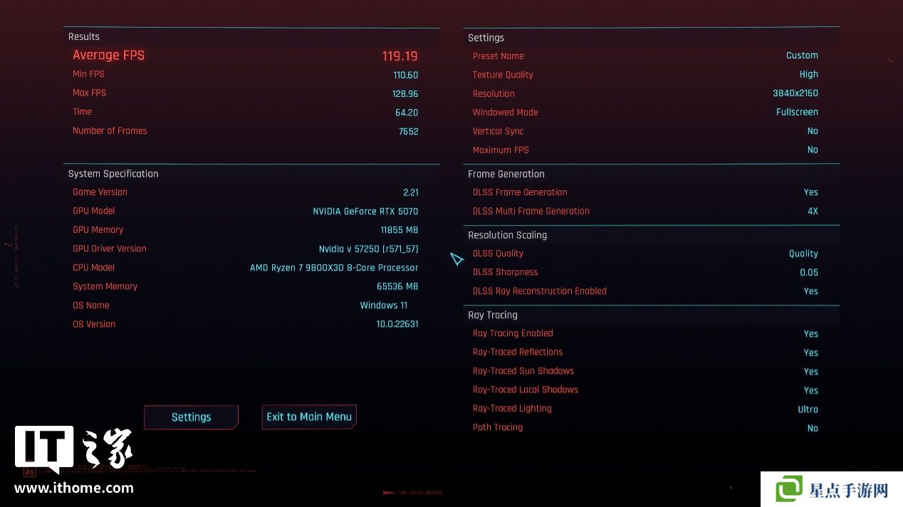 RTX 4070 在 2K 分辨率 + 最高画质 + DLSS 质量模式下,游戏平均帧数为 119 帧,1% Low 帧 51 帧,平均延迟 39ms;