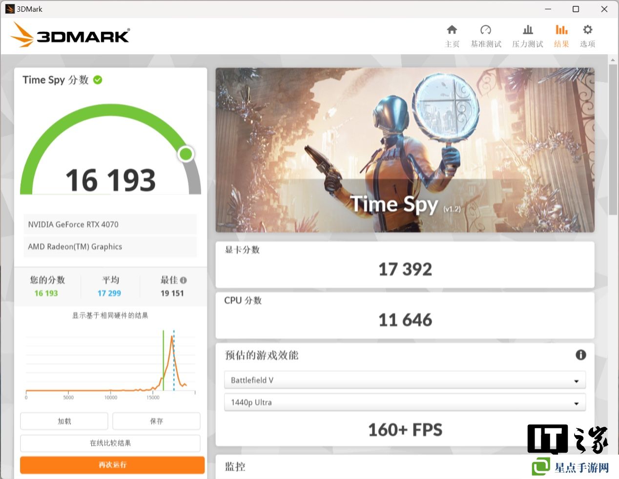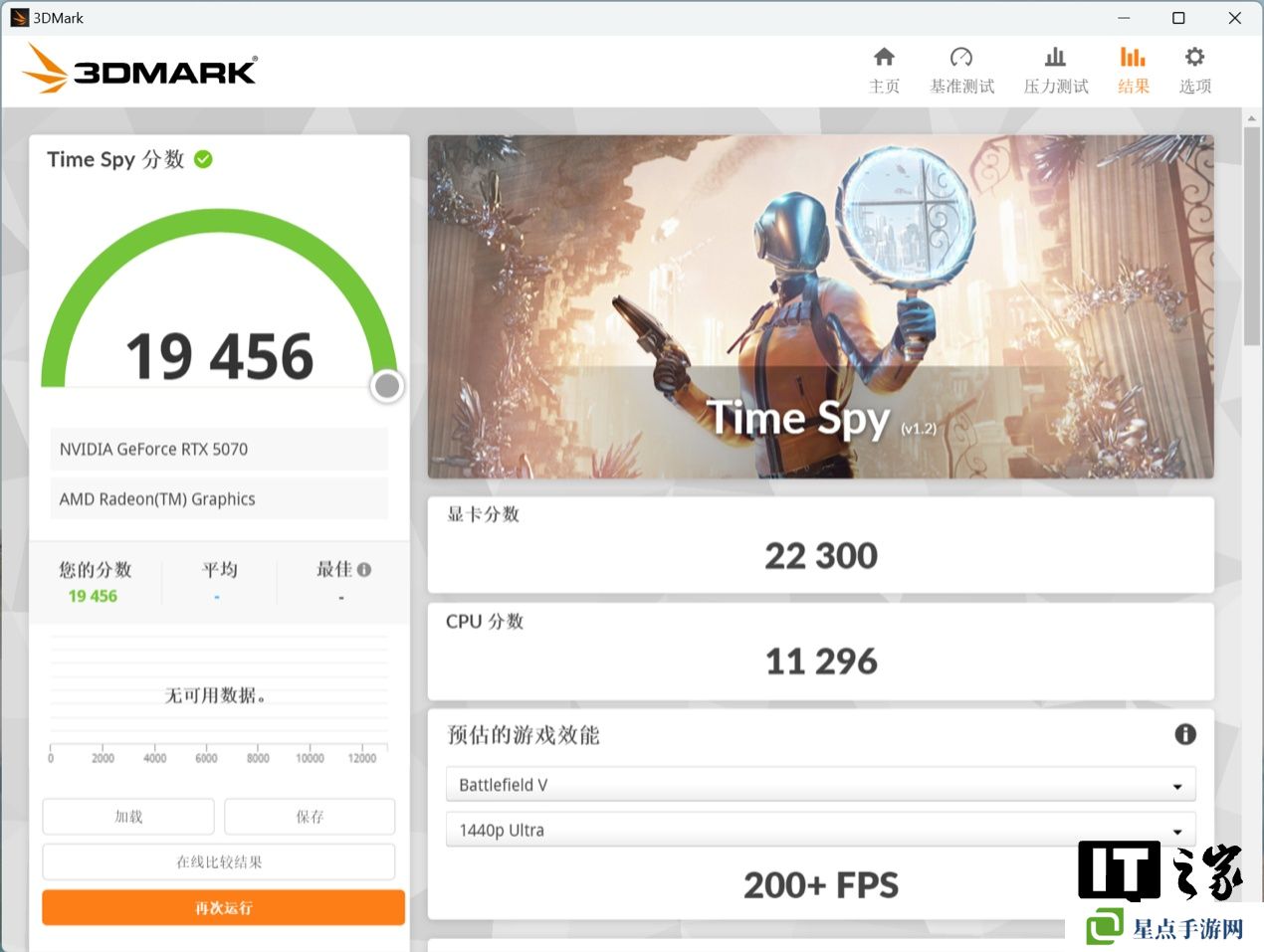 在 3DMark Time Spy DX12 测试中,NVIDIA GeForce RTX 5070 显卡分达到了 22300 分,对比 NVIDIA GeForce RTX 4070 显卡的 17392 分,提升幅度约 28.2%。